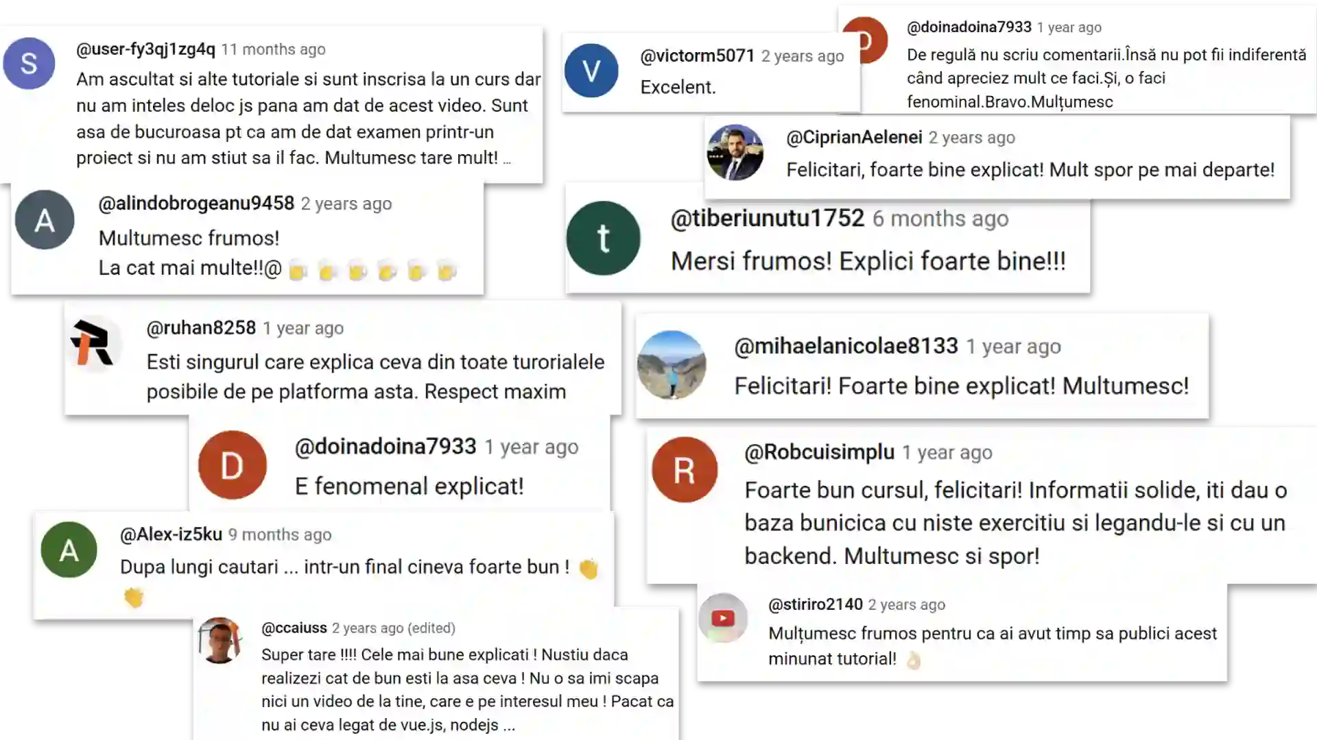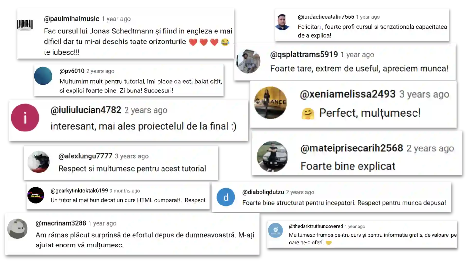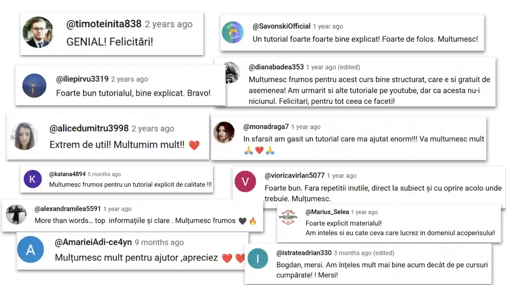 "Un curs excepțional, foarte bine structurat și explicat. De departe cel mai bun curs pe care l-am văzut până acum. Ți-am urmărit toate postările atât pe Blog cât și pe YouTube, în care dai și multe sfaturi utile. Mulțumesc frumos, Bogdan!"