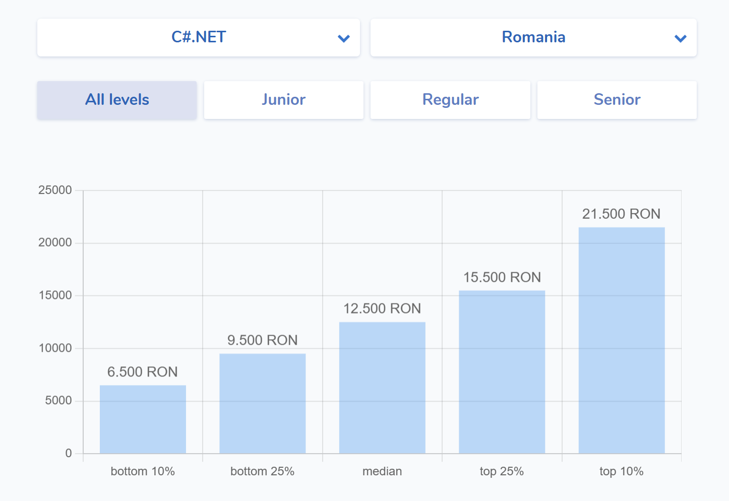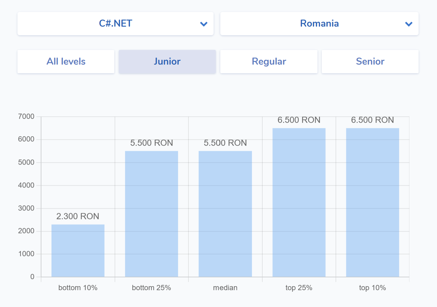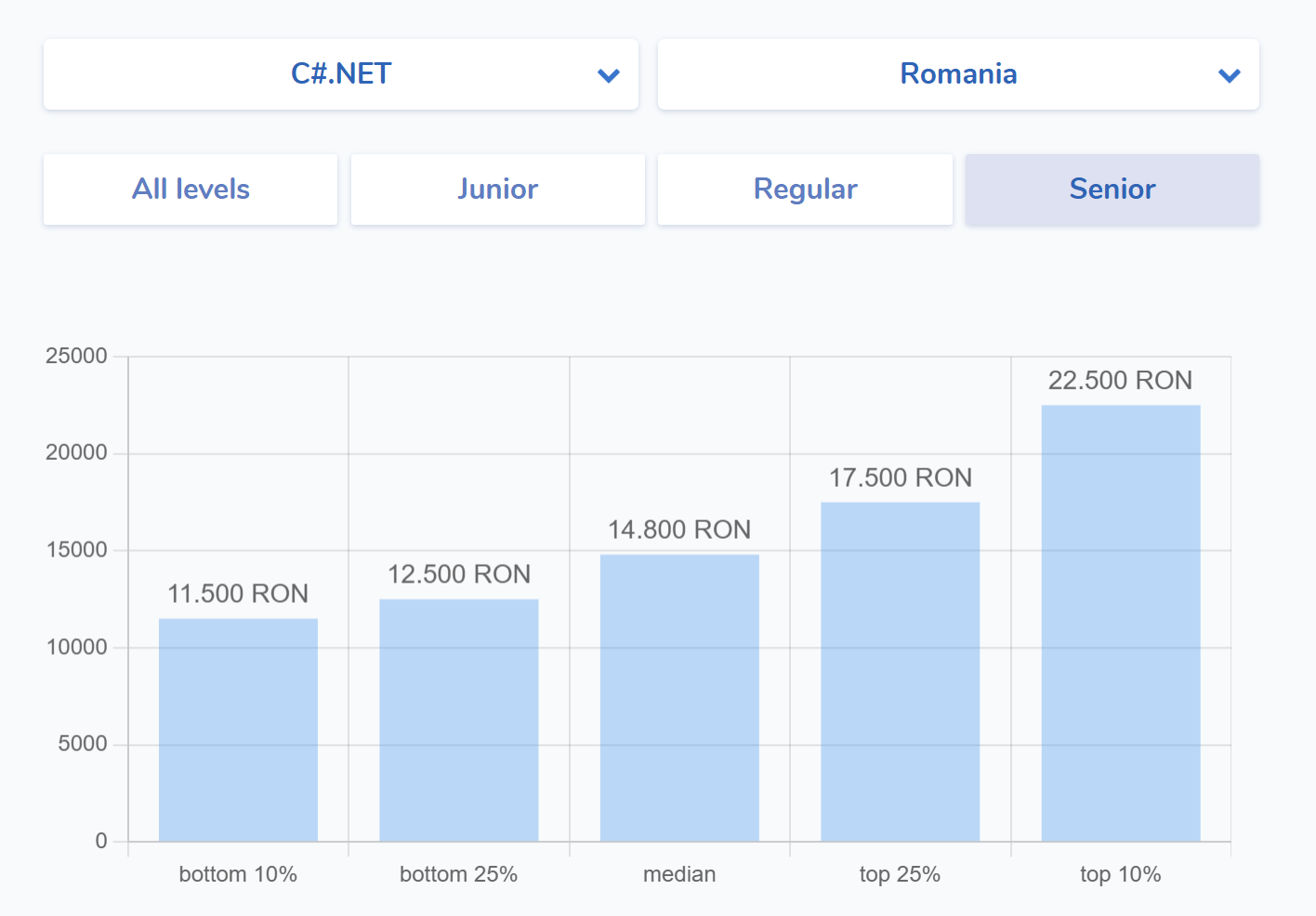 Salariul unui dezvoltator C# în România este, în medie, aproximativ 12.500 RON, pornind de la nivelul de junior la aproximativ 5500 RON și ajungând până la peste 22.000 RON la nivelul de senior.