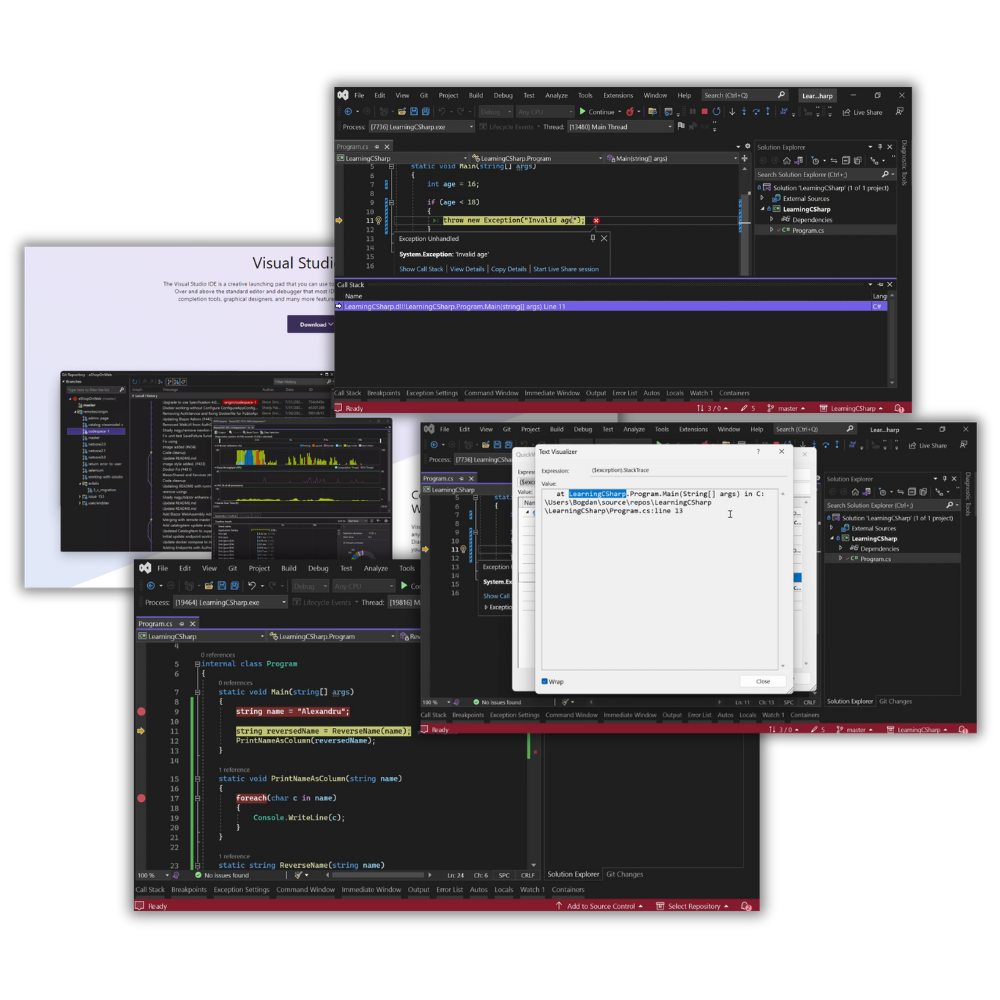 Vei putea folosi și înțelege toate uneltele oferite de Visual Studio pentru a dezvolta și depana aplicațiile. Vei înțelege cum să traversezi codul și să inspectezi starea aplicației în timp real folosind 'debugger-ul'. Astfel ești complet asigurat, pentru că Visual Studio e ceea ce folosesc toate companiile mari ce își dezvoltă aplicațiile folosind C# și .NET.