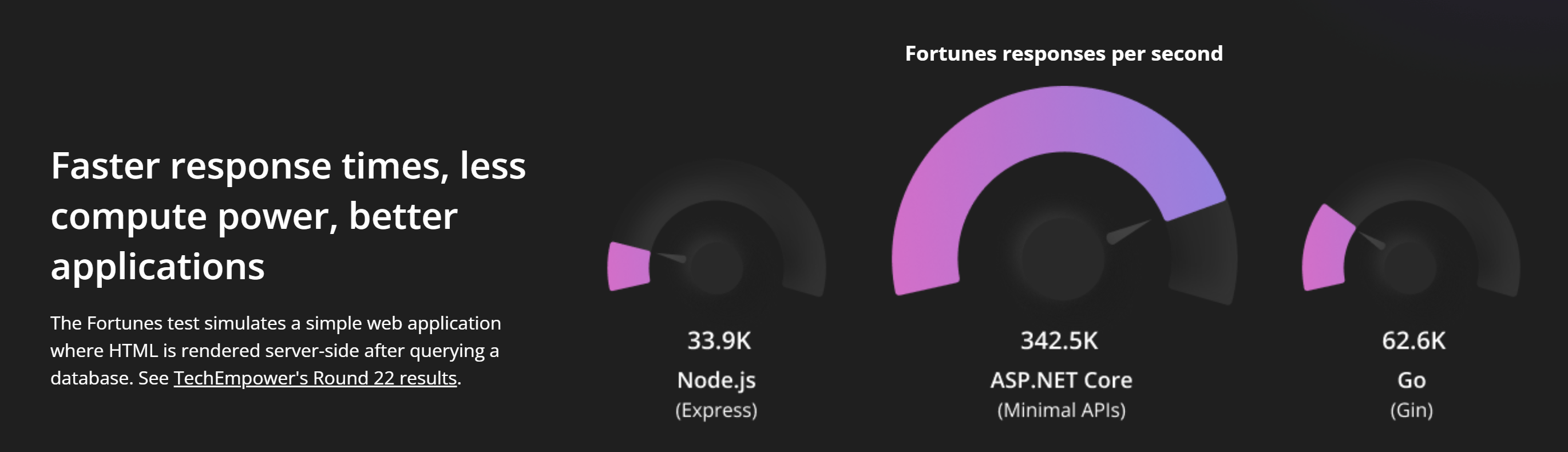 Și multe altele. C# poate fi folosit pentru toate tipurile de aplicații posibile oferind în același timp o performanță de neegalat în categoria limbajelor similare. Uite o comparație mai jos cu Node.js și Go.