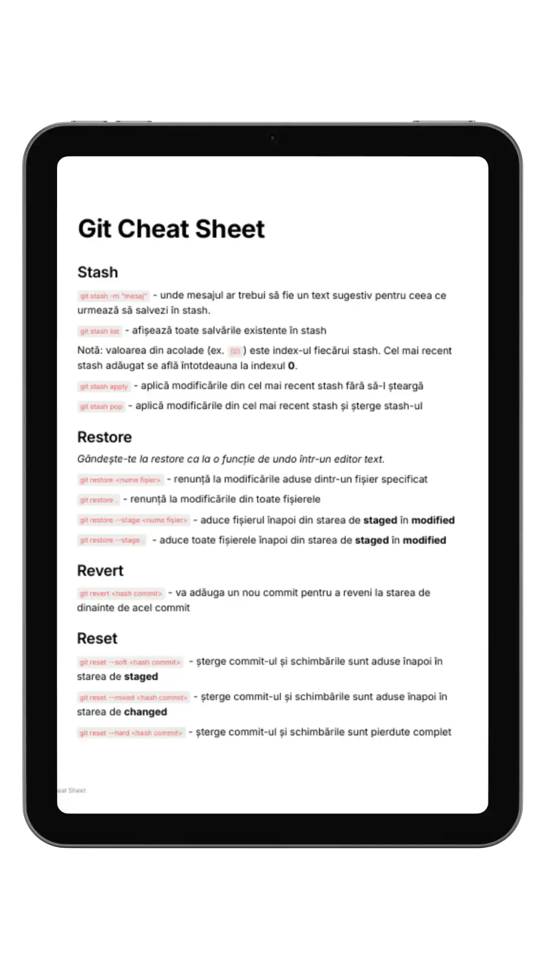 Un document de referință pe care să-l folosești dacă nu mai știi sintaxa unei comenzi anume sau nu mai știi exact ce face. Cuprinde toate comenzile discutate în curs.