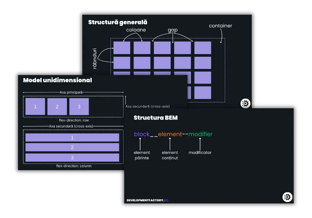 Înveți cum să folosești cele mai moderne convenții și tehnici de CSS, precum Flexbox sau Grid pentru aranjarea elementelor în pagină și a le oferi flexibilitate indiferent de tipul de ecran pe care site-ul web este afișat.